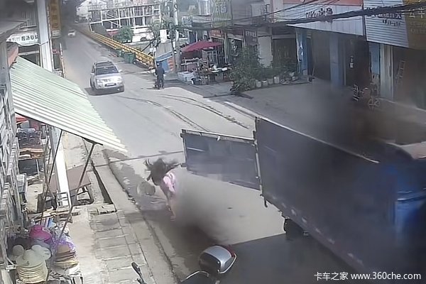 然而当货车经过该女子时,尾部的挡板被风掀起,直接拍向了女子肩膀,将她猛地拍倒在地,摔了个跟头。