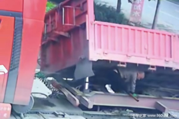 他用液压柱支撑起货车后厢,自己则蹲在底盘和货箱之间修车,没想到液压柱突然释压,失去支撑的后厢像贝壳一样闭合。