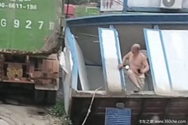 10月18日,广东东莞,一辆大货车在进停车场的时候,没注意把路边的移动厕所别翻了,司机也并不知道厕所里还有人。