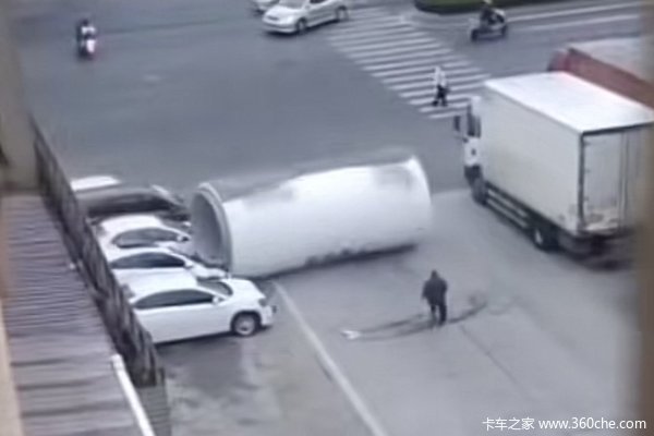 该罐体顺着斜坡下滚,路边六辆小轿车全部遭殃,最严重的车头被完全压碎。不过好在有这一排车阻挡,不然罐体可能会直接冲到马路上,后果不堪设想。