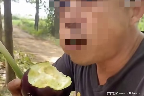 近日,一名90后大货车司机等待卸货时,饿急了蹲在路边啃着生茄子和大葱。