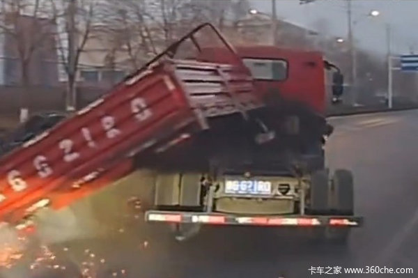 在车头继续前行的同时,货厢竟“离家出走”往左倾斜,整个脱离了车辆底盘,向对向车道滑去,可以说把后方拍摄车和对向黑车都吓得不轻。