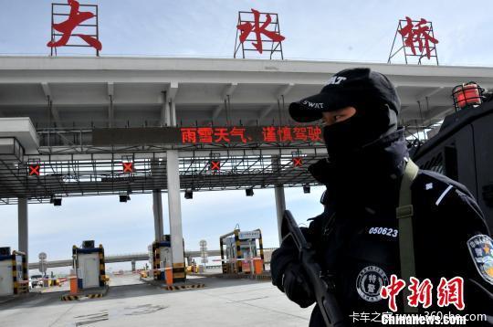 11月12日下午,京藏高速青海境内大水桥收费站,一名特警正持枪值勤。
