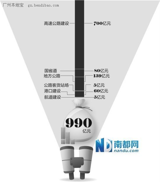 今年广东将计划投资990亿元用于交通运输基础设施建设,其中700亿元将用于高速公路建设,另外国省道将投入80亿元,地方公路将投入139亿元,公路客货站场5亿元,港口建设60亿元,航道建设将投入5亿元。