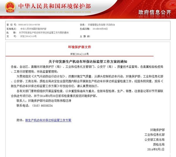 为贯彻落实《大气污染防治行动计划》,改善环境空气质量,从源头控制机动车污染,环境保护部、工业和信息化部、公安部、工商总局、质检总局(以下简称五部门)决定在全国范围内联合开展新生产机动车环保达标监督检查工作。