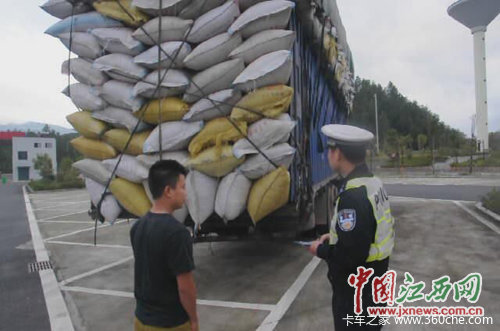 到了服务区后,民警发现该车运载的是谷壳,货物超出车辆尾部,且又未悬挂任何警示设备,货车后方一片空白,真是一辆十足的无尾车辆。通过了解,司机姓程,福建人,由德兴运载谷壳至福建蒲城,司机向民警苦诉:当前行情很差,所以就运多了,根本挣不到钱。