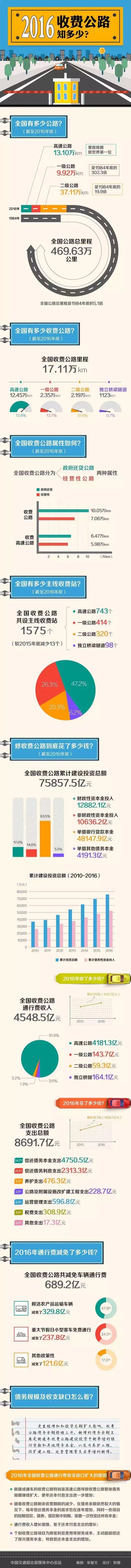 6月28日,在各地发布本行政区域2016年收费公路统计数据的基础上,交通运输部汇总发布《2016年全国收费公路统计公报》(简称《统计公报》),公布了全国收费公路的里程、建设投资、债务规模、收入支出等情况。截至2016年年底,全国收费公路里程达17.11万公里,占公路总里程的3.6%;累计建设投资总额75857.5亿元,债务余额48554.7亿元。