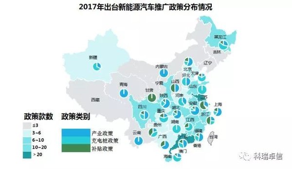 2017年出台补贴政策省份中大部分集中在中南部和沿海一带等全国经济发达地区。广东与江苏两省对新能源汽车推广补贴相对健全,全年均超过20款配套政策。