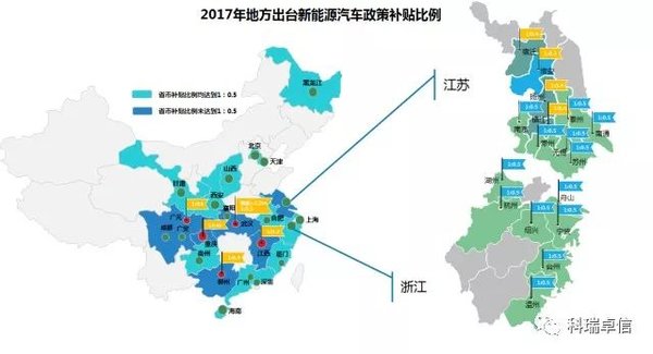 2017年,全国共有12省市新能源汽车补贴比例达到1:0.5;其中,浙江有7座城市发布,占比本省城市数量的50%以上;江苏近80%城市发布了相关补贴政策。