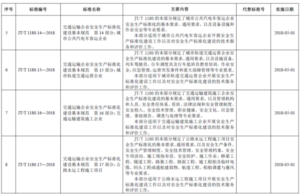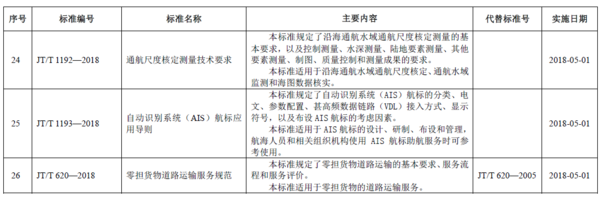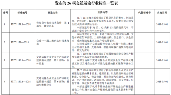 在发布的26项交通运输行业标准中,《营运货车安全技术条件 第1部分:载货汽车》规定了载货汽车的整车、制动系统、安全防护、载荷布置标识与系固点、报警与提示等安全技术要求和试验方法。本部分适用于N1类、N2类和N3类载货汽车,不适用于牵引货车和半挂牵引车,并于2018年5月1日起开始实施。
