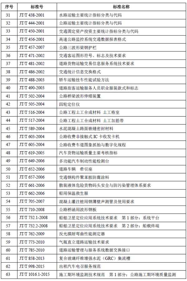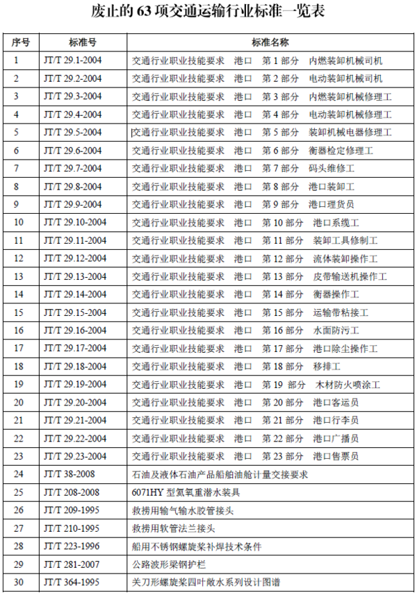 根据《深化标准化工作改革方案》(国发〔2015〕13号)和《推荐性标准集中复审工作方案》(国标委综合〔2016〕28号),交通运输部组织开展了交通运输推荐性标准集中复审工作。根据复审结论决定废止《交通行业职业技能要求 港口 第1部分 内燃装卸机械司机》等63项交通运输行业标准(见附件2),废止的标准自本公告发布之日起(2018年2月26日)停止施行。