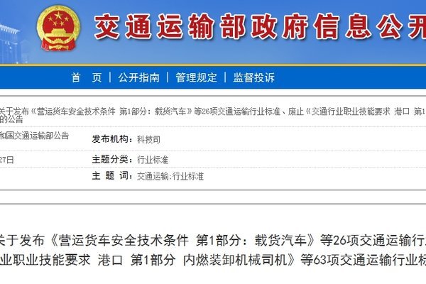 2月27日交通部官网发布了《营运货车安全技术条件 第1部分:载货汽车》等26项交通运输行业标准、废止《交通行业职业技能要求 港口 第1部分 内燃装卸机械司机》等63项交通运输行业标准的公告。