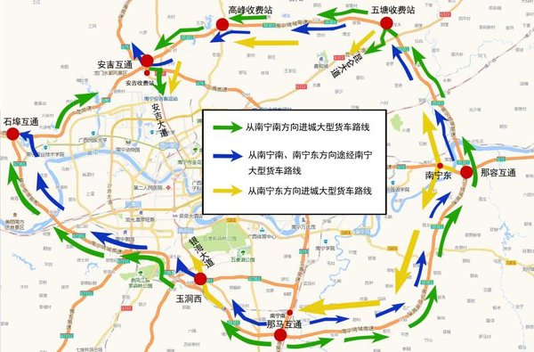 从南宁南方向进城的大型货车:可提前在那马互通绕行S5101外环高速(东环、北环),从五塘收费站进入昆仑大道、或从安吉收费站通过安吉大道进城。