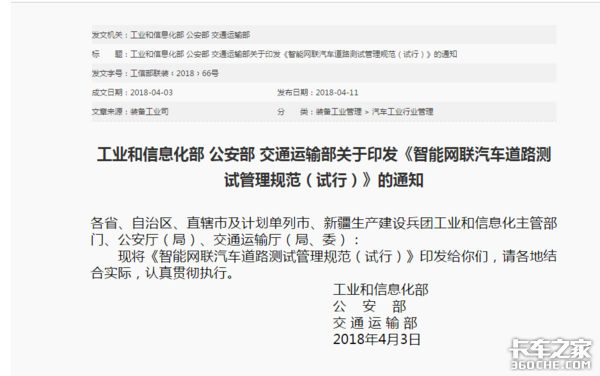 工业和信息化部、公安部、交通运输部发布的《智能网联汽车道路测试管理规范(试行)》(简称《管理规范》)将于5月1日起施行,引起业界极大关注。