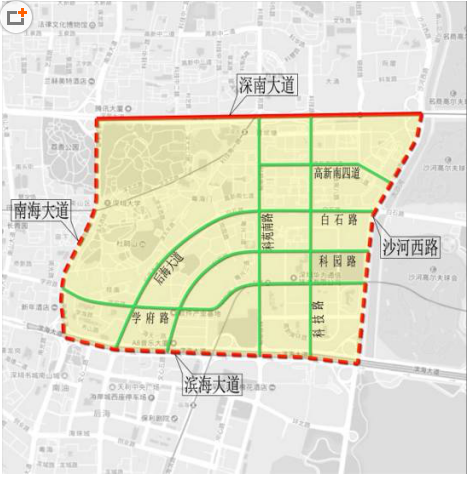 (三)南山区。科技园片区:由深南大道-沙河西路(不含)-滨海大道(不含)-南海大道(不含)合围区域。