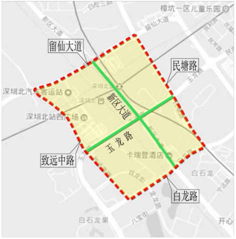 (七)龙华区。深圳北站片区:由留仙大道(不含)-民塘路(不含)-白龙路(不含)-致远南路(不含)-致远中路(不含)合围区域。