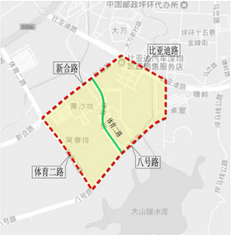 (八)坪山区。体育中心片区:由新合路(不含)-比亚迪路(不含)-体育三路(不含)-八号路(不含)-体育二路(不含)合围区域。