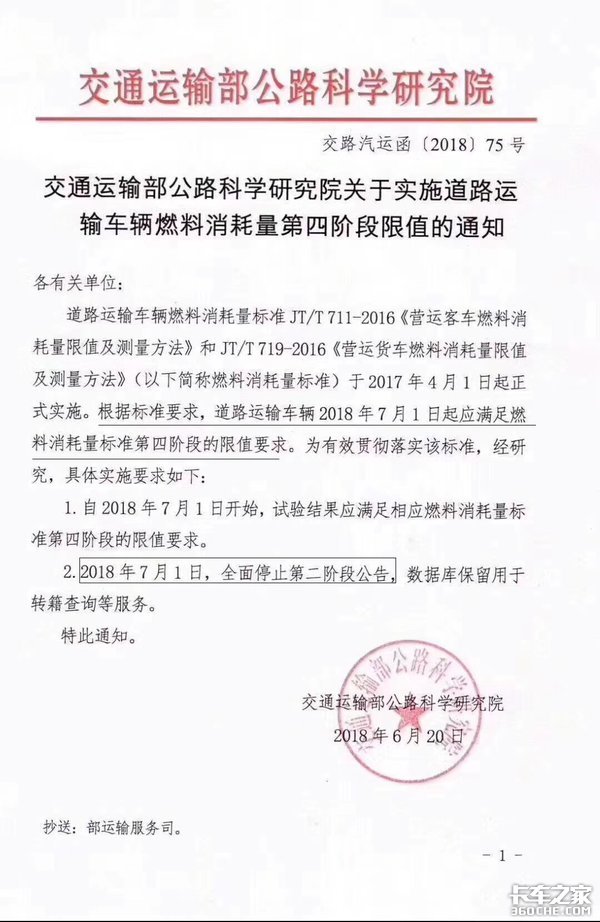 【卡车之家 原创】2018年6月20日,交通运输部公路科学研究院发布了一条关于《实施道路运输车辆燃料消耗量第四阶段限值的通知》,消息称道路运输车辆自2018年7月1日起应满足燃料消耗量标准第四阶段的限值要求。