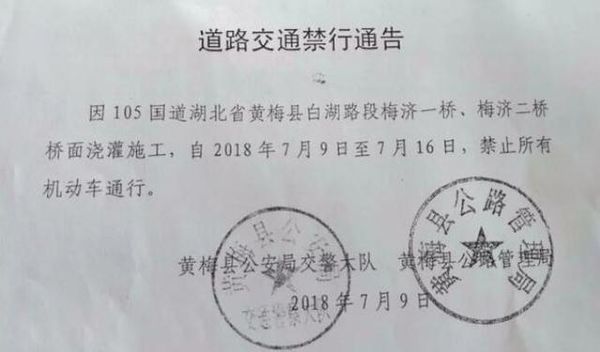 今天得了一个最新消息,因105国道白湖路段梅济一桥、梅济二桥桥面浇灌施工,对过往此路段的机动车辆进行交通管制,自2018年7月9日至7月16日,实行交通管制,禁止所有机动车通行!