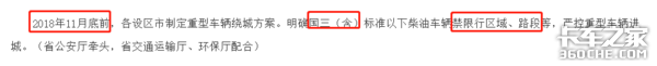 通知中表明:2018年11月底前,各设区市制定重型车辆绕城方案。明确国三(含)标准以下柴油车辆禁限行区域、路段等,严控重型车辆进城。