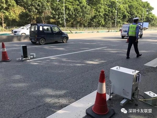 11月30日上午在龙华区观光路美泰科技园路段,记者看到,执法人员在车道两侧放置了机动车尾气检测仪,车辆一经过就可以马上检测出排气是否超标。