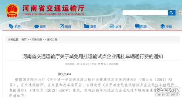 【卡车之家 原创】近日,河南省交通运输厅、省发展和改革委员会、省财政厅《关于减免甩挂运输试点企业甩挂车辆通行费的通知》。