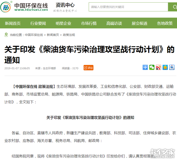 【卡车之家 原创】2019年1月4日,生态环境部、发展改革委、工业和信息化部、公安部、财政部、运输部、商务部、市场监管总局、能源局、铁路局、中国铁路总公司等11个部门联合发布了《柴油货车污染治理攻坚战行动计划》(下文简称《计划》),要求加强柴油货车超标排放治理,促进运输结构调整即促进“公转铁,公转水”,推广使用新能源和清洁能源汽车。