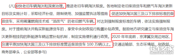 此外,还将加快老旧车淘汰和深度治理,提出:2020年年底前,京津冀及周边地区、汾渭平原加快淘汰国三及以下排放标准营运柴油货车100万辆以上。