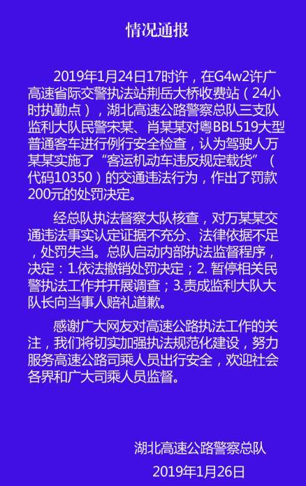 最近网上疯传了一段视频,湖北高速交警对于一辆大巴车司机因为乘客带了萝卜白菜被罚款200元,执法民警声称法律规定不能带货,青菜属于货物,27日凌晨,湖北高速交警发布通报,称处罚失当,决定撤销处罚,暂停相关民警工作,并向当事人道歉。