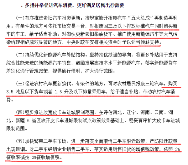 方案要求,有序推进老旧汽车报废更新。按规定放开报废汽车五大总成再制造再利用。有条件的地方可依托市场交易平台,对报废国三及以下排放标准汽车同时购买新车的车主,给予适当补助。