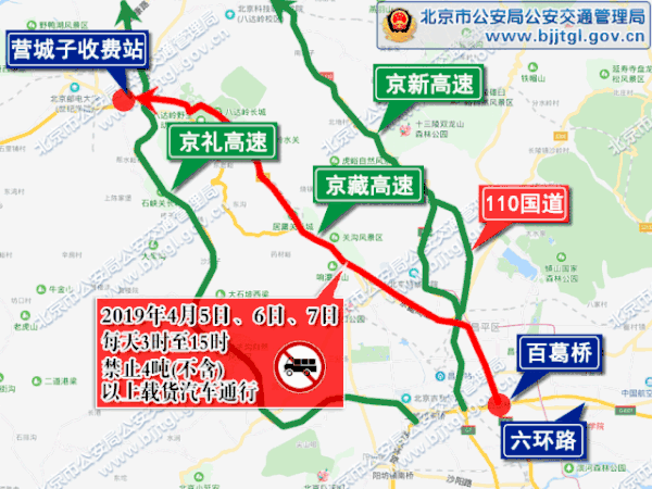 4月5日起至4月7日,每天3时至15时,京藏高速公路主路百葛桥六环路出口至营城子收费站出京方向,禁止4吨(不含)以上载货汽车通行。禁止通行的车辆可绕行京新高速、京礼高速、110国道。