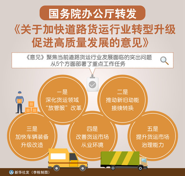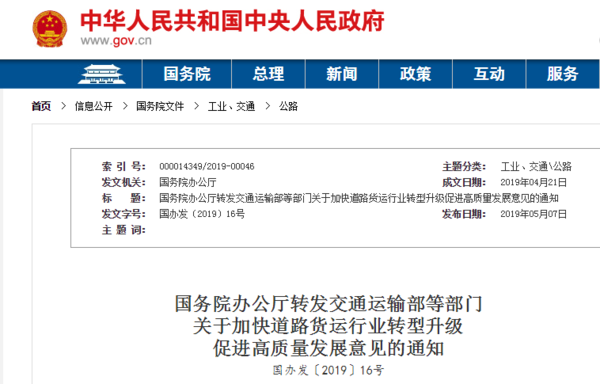 国务院办公厅转发交通运输部等部门关于加快道路货运行业转型升级促进高质量发展意见的通知。