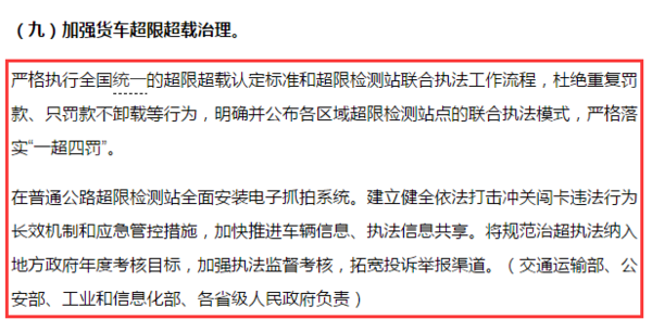 如今,国务院专门转发此《意见》,纠正问题,清除积弊,而且还将“规范治超”纳入地方政府年度考核目标,加强执法监督考核,拓宽投诉举报渠道,足见国家对货车超限超载治理工作的决心!