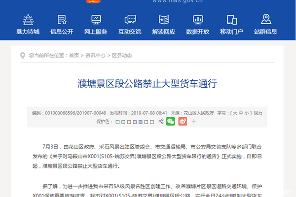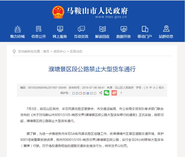 7月3日,由花山区政府、采石风景名胜区管委会、市交通运输局、市公安局交警支队等多部门联合发布的《关于对马鞍山市X001(S105-皖苏交界)濮塘景区段公路大型货车限行的通告》正式实施,自即日起,濮塘景区段公路禁止大型货车通行。