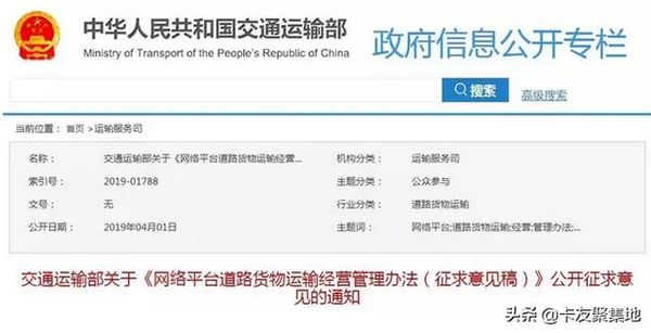 为贯彻落实党中央、国务院关于推进“互联网+”高效物流发展相关部署要求,加快推进道路货运行业转型升级高质量发展,4月1日,交通运输部发布了《网络平台道路货物运输经营管理办法(征求意见稿)》的通知,向社会公开征求意见。