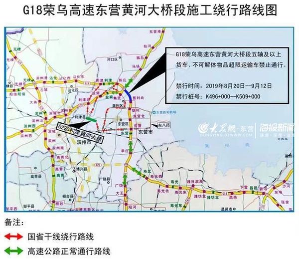 16日,大众网海报新闻记者获悉,G18东营黄河大桥段因养护维修,2019年8月20日0时-2019年9月12日24时对通行车辆实施限速限行交通管制措施。