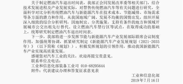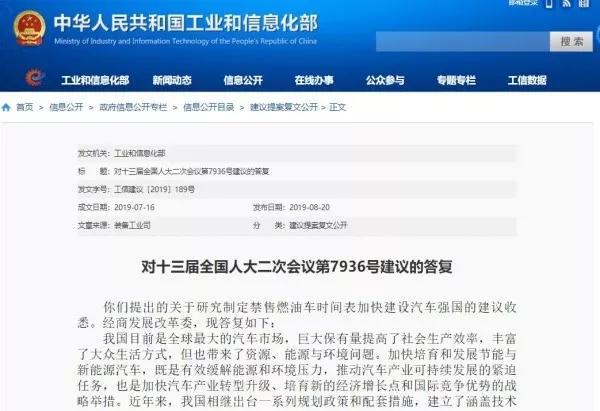 在《对十三届全国人大二次会议第7936号建议的答复》(以下简称《答复》)中,工信部明确表示,正会同发改委等部门对禁售传统燃油汽车等问题进行研究,并且支持有条件的地方和领域开展城市公交出租先行替代、设立燃油汽车禁行区等试点,在取得成功的基础上,统筹研究制定燃油车退出时间表。