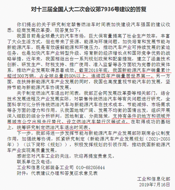 近日,工信部发布了对《关于研究制定禁售燃油车时间表加快建设汽车强国的建议》的答复。