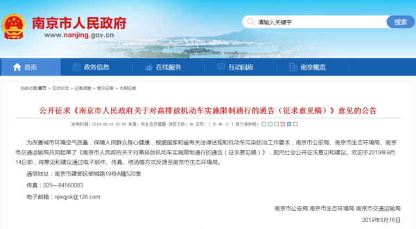 近日,南京市人民政府发布《关于对高排放机动车实施限制通行的通告(征求意见稿)》,通告中指出自2019年10月15日起,在绕城高速公路G2503(不含本道路)合围区域内,每日7时至24时禁止高排放机动车通行。