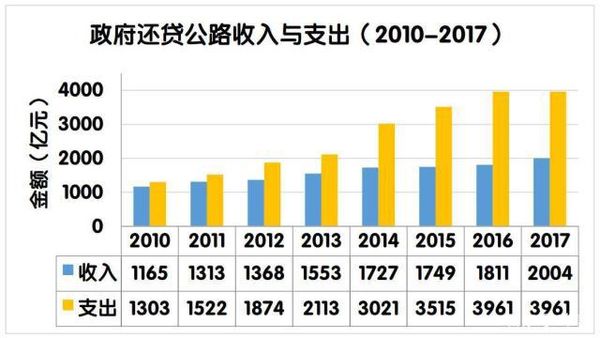 据统计,2018年度中国高速公路总收费5552.4亿元,支出9621.8亿元,其中支出债务本金5066.7亿元,利息2647.9亿元,养护费用589.3亿元,管理费、税费、其他支出等总计1100多亿元。