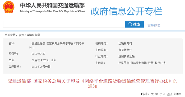 交通运输部、国家税务总局在系统总结无车承运人试点工作的基础上,制定了《网络平台道路货物运输经营管理暂行办法》(以下简称《办法》),现将《办法》印发给你们,请遵照执行。