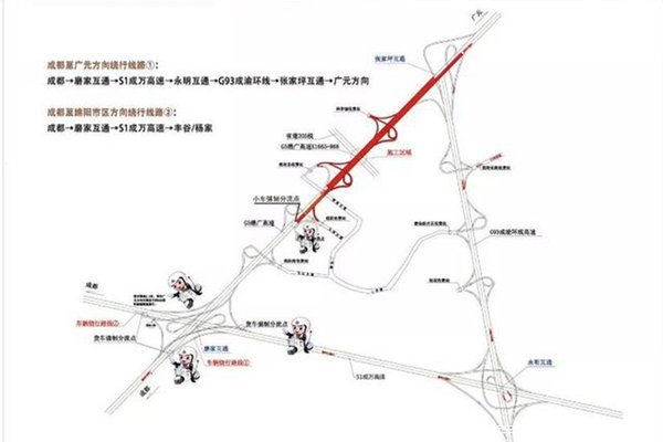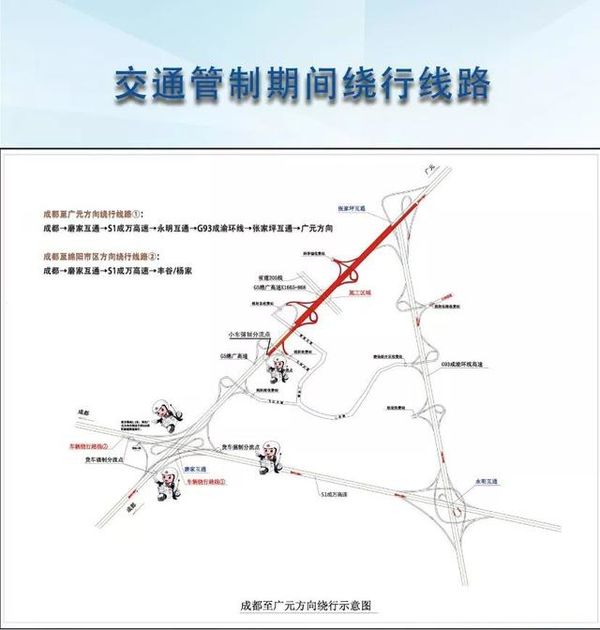 前往广元方向车辆在磨家枢纽绕行;仅限绵阳市市区小车在绵阳南、绵阳收费站(金家林)出站。