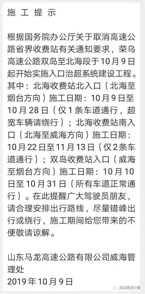 双岛收费站入口(威海至烟台方向)施工期为10月10日至10月31日,所有车道正常通行。