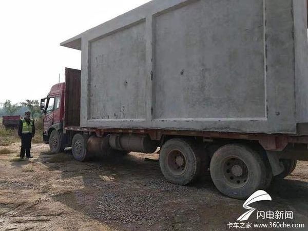 随后,执勤民警立即示意该车靠边停车,接受检查。检查中,民警发现这两辆货车上都拉着一座巨大的“移动板房”,板房为水泥材质,四四方方,看上去像是个改造后的“房车”,特别引人注目。