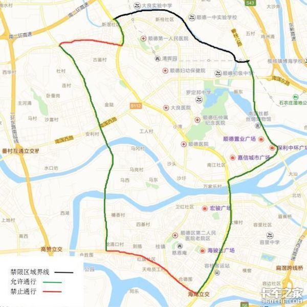 2、顺德中心城区限货区域为碧桂路、德胜路、105国道、红旗路、伦桂路、顺翔路、凤翔路、105国道及桂畔海闭合区域(不含105国道、碧桂路、德胜路、伦桂路)。