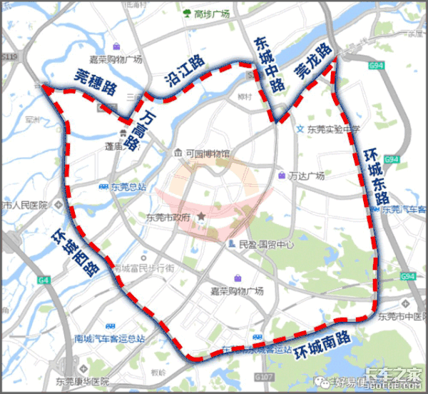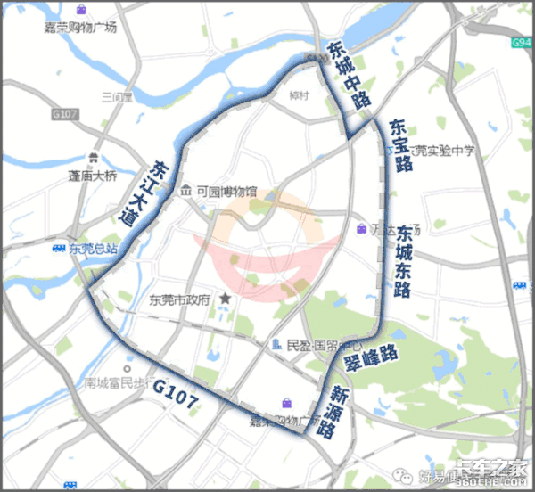 1、东宝路—东城东路—翠峰路—新源路—G107—东江大道—东城中路—莞龙路—东宝路连接范围以内(不含上述道路)每天7:00-9:00、16:00-20:00禁止载货汽车通行。