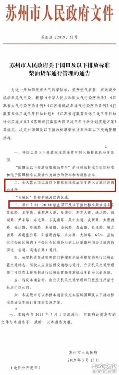 2、每日7:00~20:00禁止国Ⅲ及以下排放标准柴油货车在苏虹路、星华街、独墅湖大道、星塘街、东方大道、通达路、通湖路、尹丰路、东进路、东吴南路、吴中大道、友新路、太湖西路、福运路、晋源路、苏福路、金枫路、泰山路、长江路、城北西路、苏虞张公路、阳澄湖西路、永方路、太阳路、G524、星杭街闭合的区域内(不含闭合区域外沿的上述道路和闭合区域内的国道、省道、高速公路)通行。