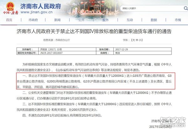 禁止达不到国Ⅳ排放标准的重型柴油货车(车辆最大总质量大于12000KG)进入G35济广高速公路济南段、G3京台高速公路济南段、G2001绕城高速公路南线、G2京沪高速公路济南段以内区域(不含上述道路)及长清区、章丘区、平阴县、济阳县、商河县的城市建成区通行。