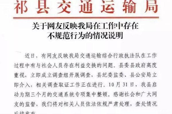 针对网传“山西祁县交通运输局存在乱执法且与黄牛勾结”一事,祁县县委宣传部10月31日下午回应称,当地已展开核查。而当地祁县交通运输局有工作人员则直接否认本局执法队存在与黄牛勾结等问题。