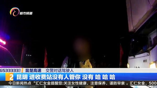 交警对话驾驶人:“你从哪里拉过来的?昆明 进收费站没有人管你?没有,哈哈哈。你知不知道你这个是什么行为?知道,超高超长。”